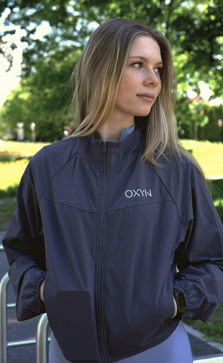 Enostavna, a elegantna. Popolna za sproščene sprehode ali športne aktivnosti. Nosiš jo v prehodnih obdobjih ali kot dodatno plast ob hladnejših večerih. Ima visok ovratnik in se zapira z zadrgo. Na sprednjem delu jakne je naš logotip OXYN.