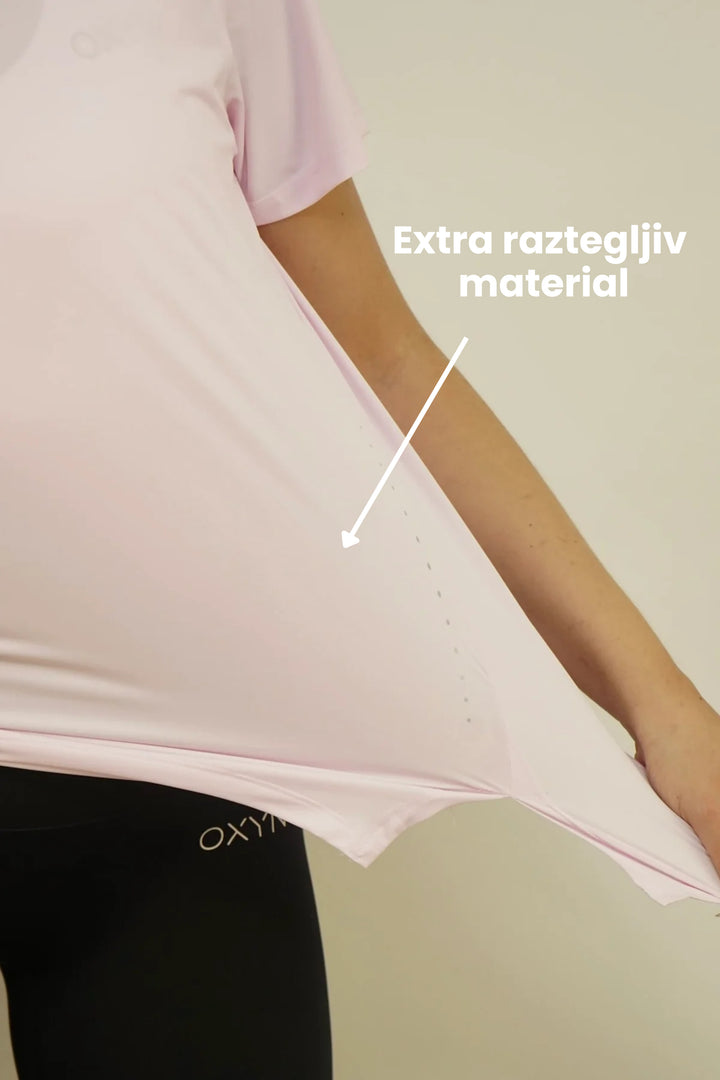 - Lahek in prožen material: Material majice je lahek, kar se vidi po tem, kako se sproščeno obnaša na telesu.